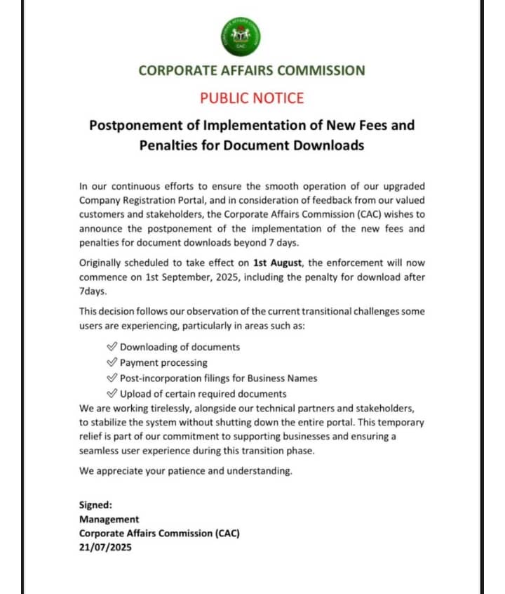 The Corporate Affairs Commission (CAC) has announced the postponement of the implementation of its newly introduced service fees and penalties, shifting the effective date from August 1 to September 1, 2025. The decision was made to allow stakeholders and users of the commission’s upgraded online portal more time to adapt to the changes and ensure a smoother transition.
