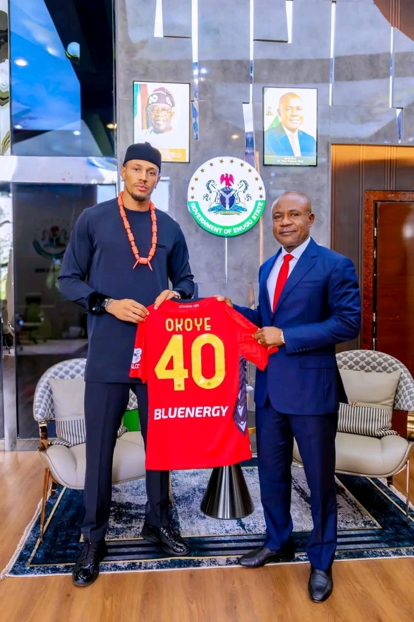 Super Eagles goalkeeper Maduka Okoye paid a courtesy visit to Governor Peter Mbah of Enugu State today, as he continues to enjoy his off-season break in his hometown.