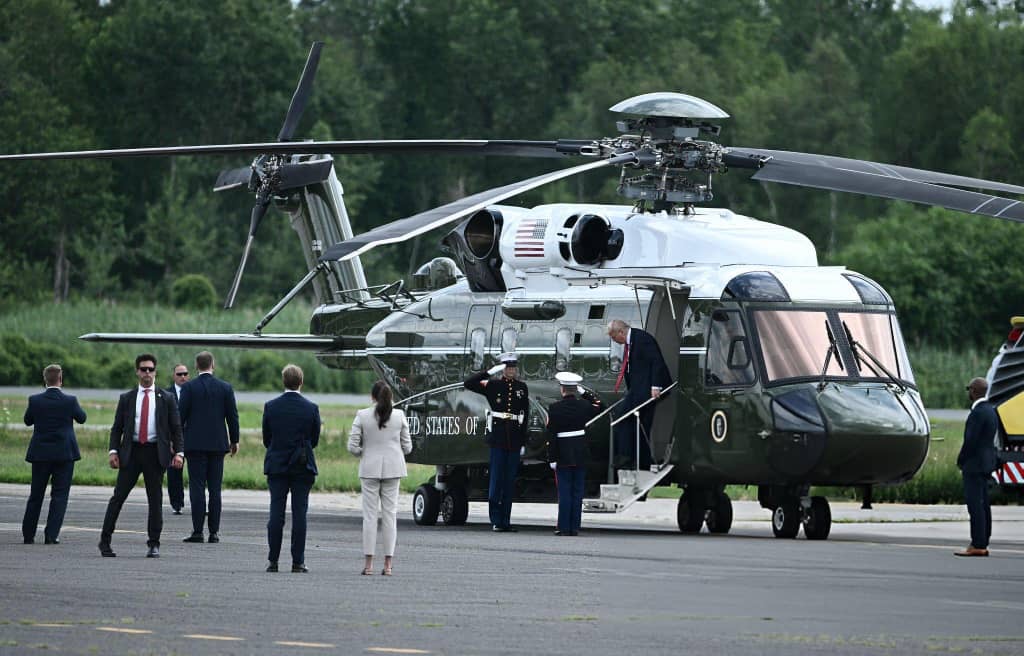 The chopper left from Teterboro Airport after Trump and first lady Melania Trump traveled from their golf club in Bedminster, New Jersey to East Rutherford for the inaugural championship match of the newly-expanded tournament.